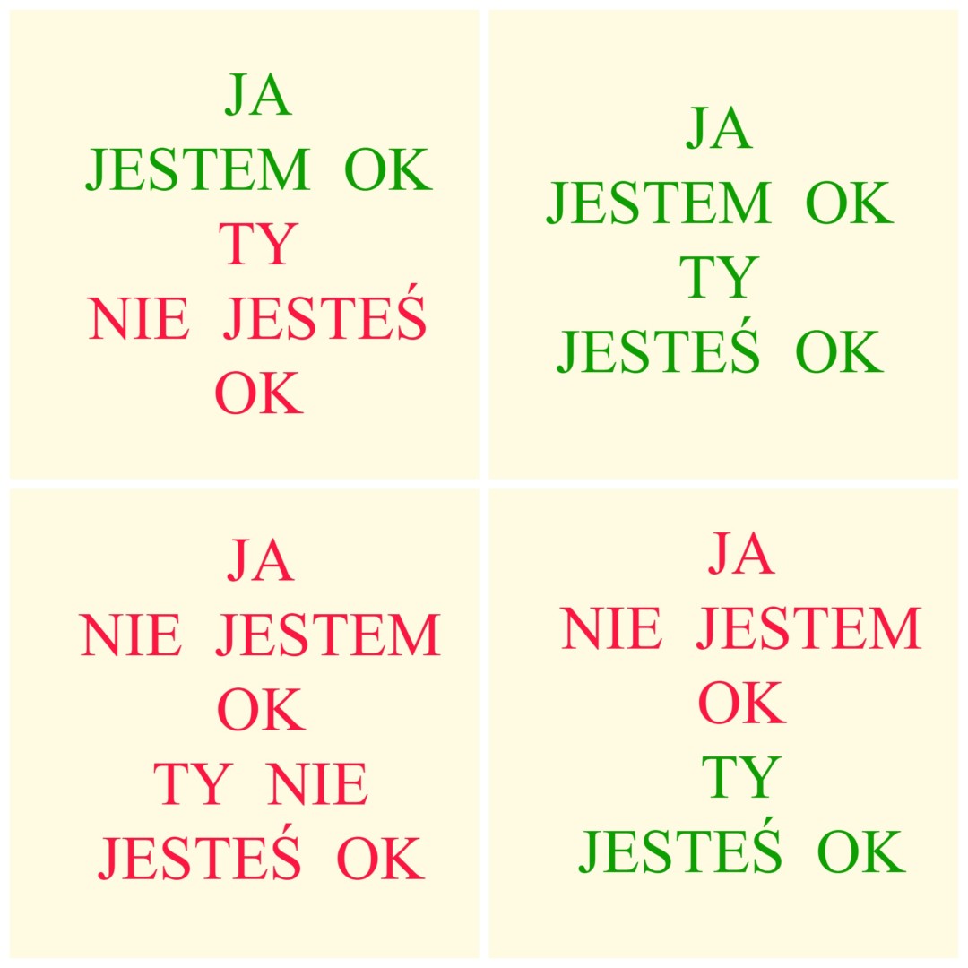 Oczywiście te postawy wobec świata mogą się zmieniać w zależności od tego, z kim mamy do czynienia. W niektórych relacjach bardzo trudno nam przyjąć, że ktoś jest w porządku, podczas, gdy w innych zaczynamy podejrzewać, że to z nami jest coś nie tak, skoro próbujemy na różne sposoby, a wciąż nie wychodzi.